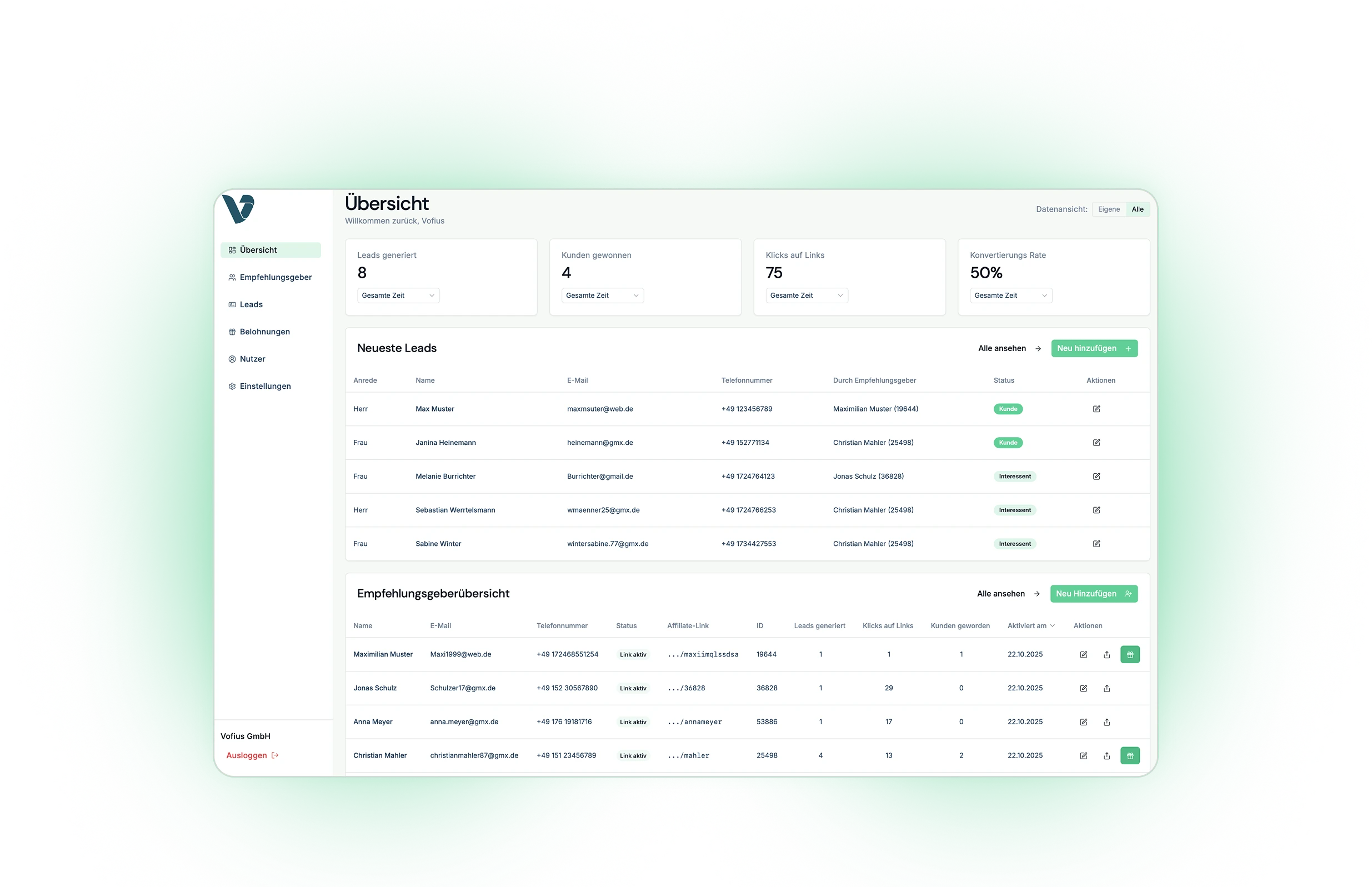 Ein zentrales Dashboard, alle Daten. Sehen Sie jeden Lead, jeden Empfehlungsgeber und jede Auswertung in Echtzeit und treffen Sie datenbasierte Entscheidungen.